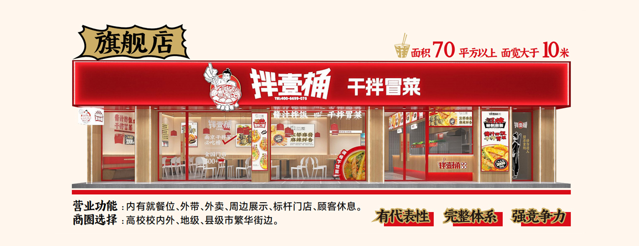 拌壹桶干拌冒菜創始于2019年,現已累計開出400+門店,覆蓋18省、自治區100多家城市。創立6年堅持以[讓國人吃到好吃、干凈、新鮮的冒菜】的形式, 打開中國乃至全球冒菜市場。拌壹桶干拌冒菜--2019至今,喜愛拌壹桶的消費者涵蓋小孩兒、大學生、上班族、熱愛吃喝的大人們。品牌初衷不變--用心、專注、踏實地為顧客提供美食,放肆吃喝放肆嗨。